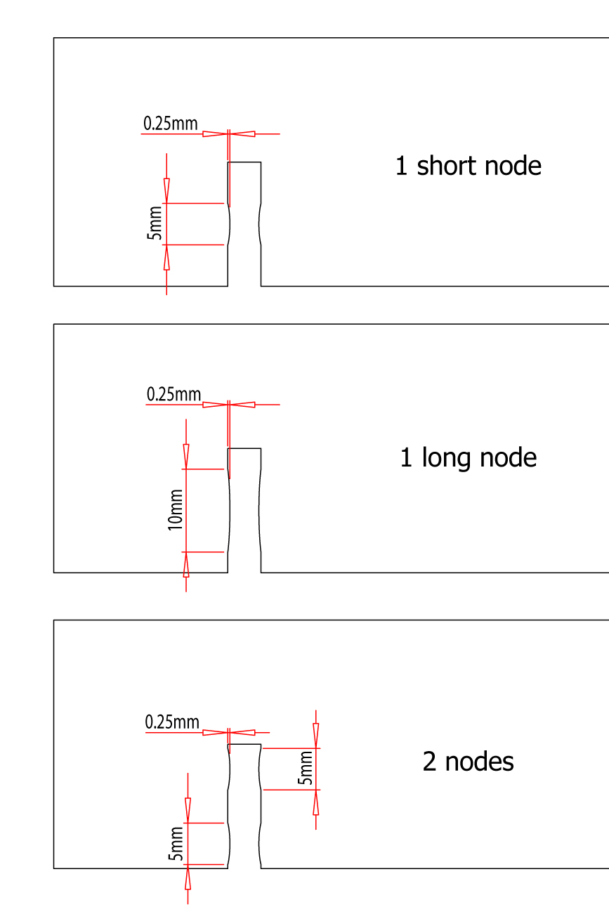 Width of the node – This will depend on the material you are using. If the material is dense, like MDF, and has little compression then the nodes should be shallow about 0.01in or 0.2mm each. So taking into account of nodes on both sides of the slot, that allows for 0.02in or 0.4mm in variation. If the material is less dense, like Eurolite Poplar, and therefore can compress more then you can use a bigger node, 0.02in or 0.5mm. It might pay to test a few different sizes in some mock ups (like the examples below) before committing to your full design to test exactly what will work with the material you wish to use.